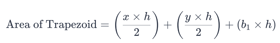 \begin{align*} & = \frac{xh}{2} + \frac{yh}{2} + \frac{2b_1h}{2} \\ \\ & = \frac{xh + yh + 2b_1h}{2} \\ \end{align*}Factoring out \(\Large{\frac{h}{2}}\), we have